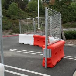 The chain link fence will attach to the top of a longitudinal barrier, like the TrafFix Water-Wall, creating additional security for a work zone. The mesh fence will be made of 11 gauge steel, connected to vertical steel posts of 1 ⅝" diameter. Fence sections will be 6' wide × 4' tall. Each fence section shall weigh no more than 42 lbs including the connector T-pin. Each T-pin will extend down through the sections of fence into the knuckles of the TrafFix Water-Wall to securely connect the fence to the wall. Each T-pin shall have a hole at the upper end for a bolt to enhance security. The fence will accommodate a 6' single gate or a 12' double gate for entrance and exit from the work zone. For maximum stability, the TrafFix Water-Wall, filled with water will weigh 1,110 pounds. Overall height of the Water-Wall Fence attached to the top of the TrafFix Water-Wall will be a minimum of 84".